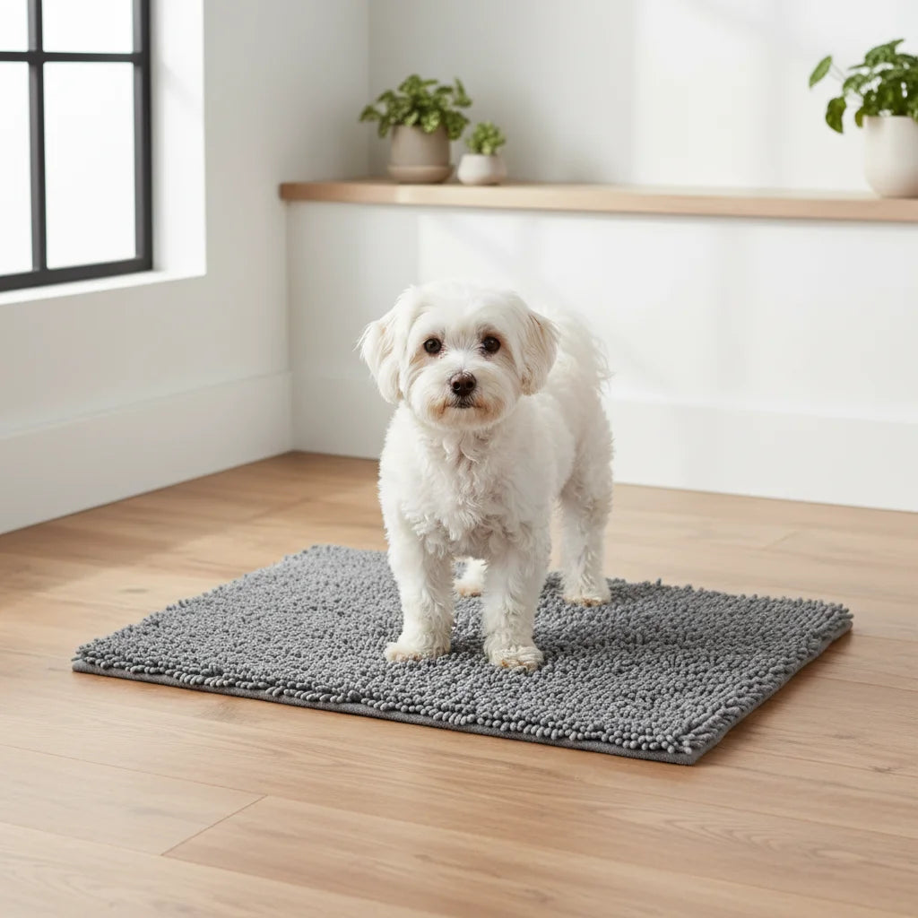 Le tapis est conçu avec des fibres ultra-absorbantes qui retiennent l’eau, la boue et la saleté dès que le chien pose les pattes dessus.